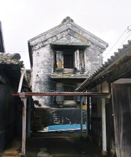 明治2年建築で、南北に長い敷地の北寄りに建っています。1階2階とも街路に面した北面廻りを塗り込めて防火的なつくりとしているのが特徴です。 |